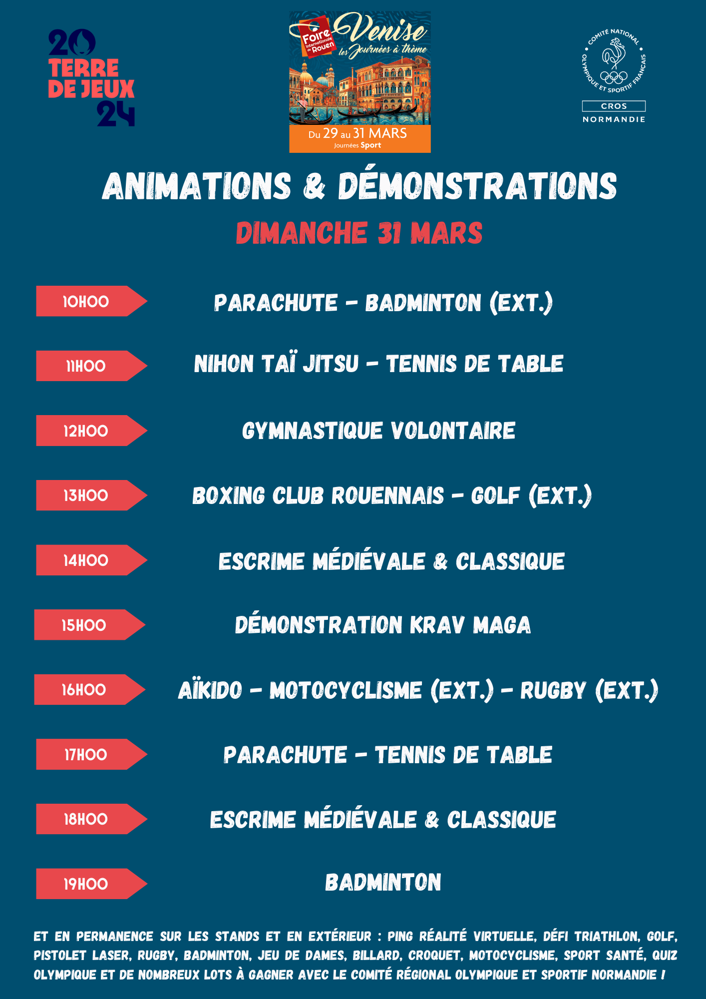 Au programme de ce week-end d’ouverture (vendredi 29 au dimanche 31 mars), ce ne seront pas moins de 21 disciplines sportives qui seront présentes, coordonnées par le Comité Régional Olympique et Sportif Normandie, le tout sur un planning d’animations intense de 10h à 20h !